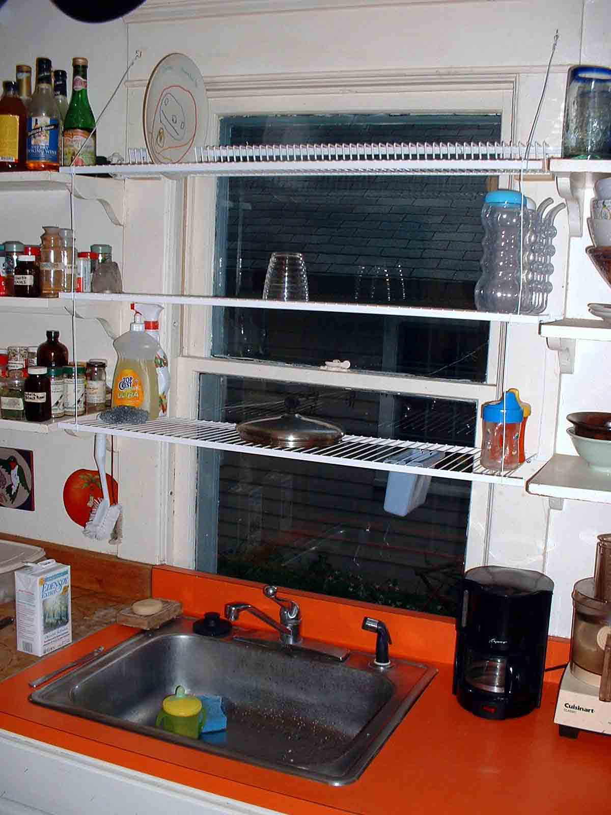 Kitchen Sink. Three shelves held up by screws and coat hangers. The small screw connections at the wall are well-modeled as pin joints. Viewed from the side, this 2D truss has 6 bars (3 shelve & 3 coat hangers) and 7 joints (one at the front and back of each shelf, and one at the top), and 8 reaction forces (2 at the wall end of each shelf and 2 at the top of the top hanger). Thus, the "rule of thumb, number of equations equal number of unkowns" formula works: 8 + 6 = 2*7. But this truss is not rigid if not connected to the wall. The rule of thumb for "rigid when unconnected" does not work: 3 + 6 < 2*7. Truss assembled at 227 Bryant Ave, Ithaca, NY on 9/15/02.