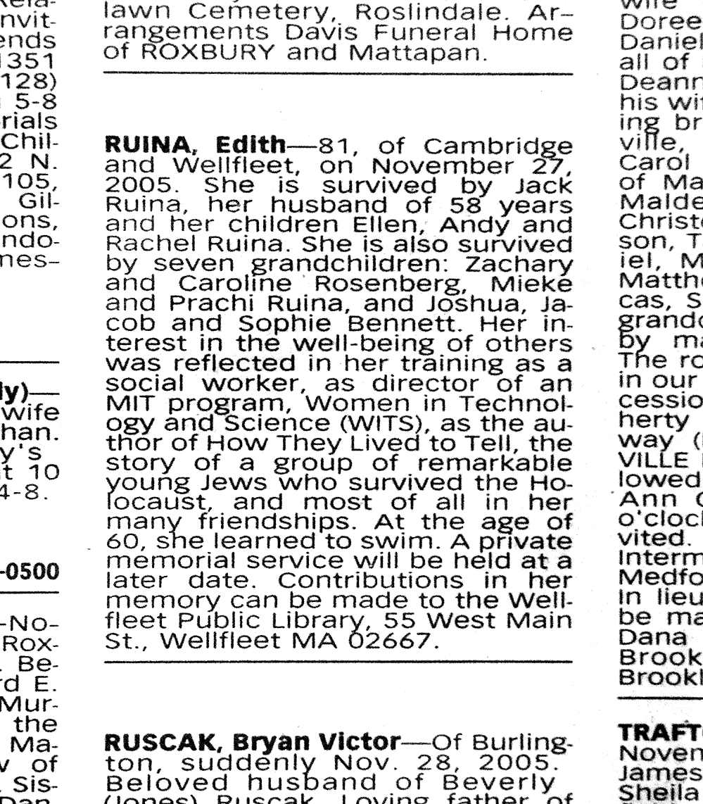 Boston Globe Obituary (Nov 30, 2005): Ruina, Edith - 81, of Cambridge and Wellfleet, on November 27, 2005. She is survived by Jack Ruina, her husband of 58 years and her children Ellen, Andy and Rachel Ruina. She is also survived by seven grandchildren: Zachary and Caroline Rosenberg, Mieke and Prachi Ruina, and Joshua, Jacob and Sophie Bennett. Her interest in the well-being of others was reflected in her training as a social worker, as director of an MIT program, Women in Technology and Science (WITS), as the author of How They Lived to Tell, the story of a group of remarkable young Jews who survived the Holocaust, and most of all in her many friendships. At the age of 60 she learned to swim. A private memorial service will be held at a later date. Contributions in her memory can be made to the Wellfleet Public Library, 55 West Main St., Wellfleet MA 02667.